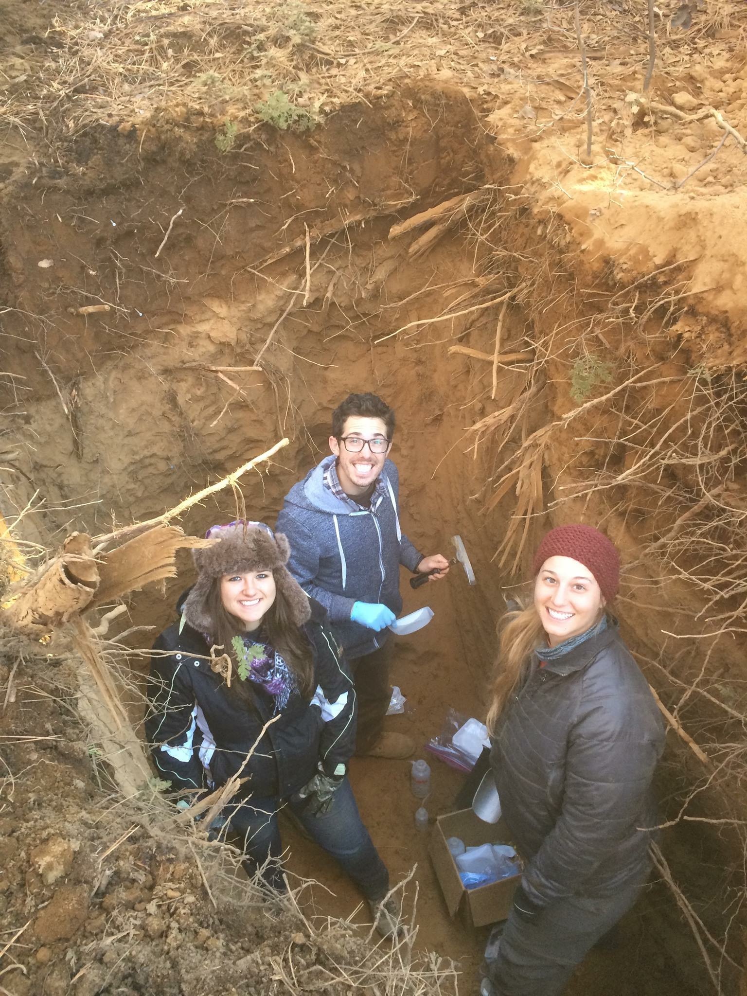 Kimber Moreland (left), myself (center), and Morgan Barnes (right) collecting soils from this 2+ m pit!